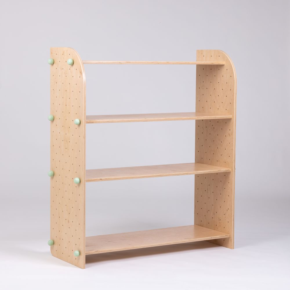 A moduláris polcrendszer szinte végtelen variációban építhető fel: alacsony játéktárolótól a magas könyvespolcig, akasztós ruhaállványig minden igényre létezik kialakítás. A szerkezet évről évre alakítható, bővíthető, átrendezhető.